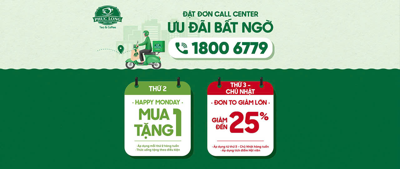 Mùa lễ hội cuối năm đã đến, Phúc Long mang đến chương trình ưu đãi đặc biệt dành cho khách hàng khi đặt đơn qua hotline 1800 6779 để làm cho những buổi tiệc của bạn thêm trọn vẹn niềm vui!