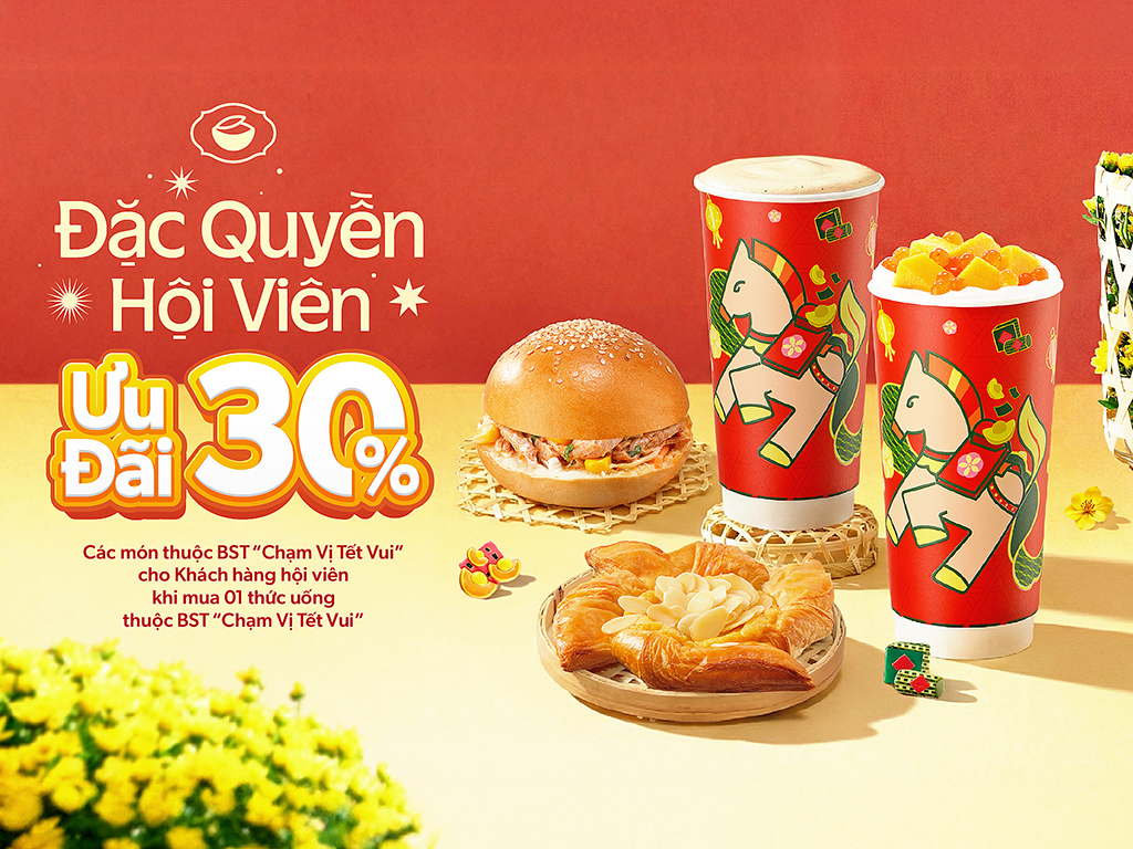 Chương trình Khuyến mãi: Mua 1 thức uống thuộc BST "Chạm Vị Tết Vui" được tặng 1 coupon giảm 30% thức uống và bánh thuộc BST "Chạm Vị Tết Vui" sử dụng cho hóa đơn tiếp theo